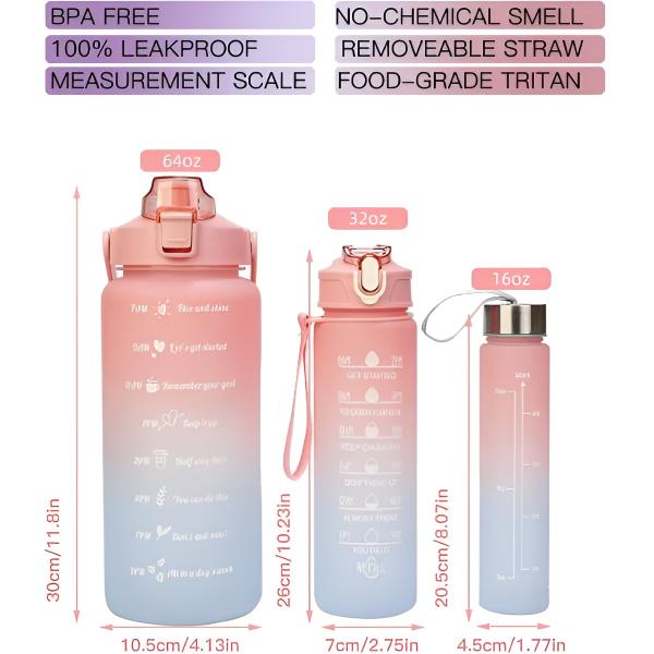 Αυτό το σετ περιλαμβάνει τρία μπουκάλια νερού σε διαβαθμισμένο χρώμα, το καθένα από τα οποία διαθέτει μια φράση με κίνητρα στο μπροστινό μέρος και μετρήσεις όγκου στο πίσω μέρος.