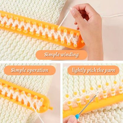 • Η συσκευασία περιέχει: 4x βοήθηματα πλεξίματος διαφορετικών μεγεθών, 1x γάντζος για την αφαίρεση του τελικού προϊόντος, 2x βελόνες, 1x οδηγίες