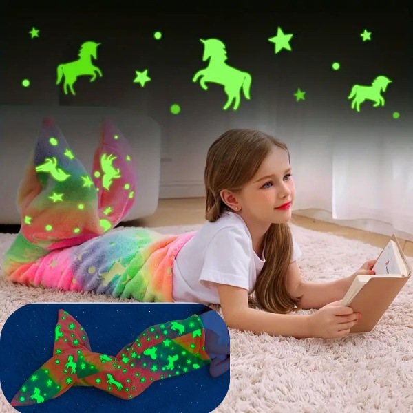 Η κουβέρτα MERMAIDREAM λάμπει στο σκοτάδι, παρέχοντας ένα ηρεμιστικό φως για να απαλύνει τους νυχτερινούς φόβους. Απλά εκθέστε την στο φως της ημέρας για 20 λεπτά και θα λάμπει απαλά όλη τη νύχτα. Επιλέξτε το σχέδιο με ουρά καρχαρία ή ουρά γοργόνας για πρόσθετη μαγεία καθώς το παιδί σας κοιμάται.